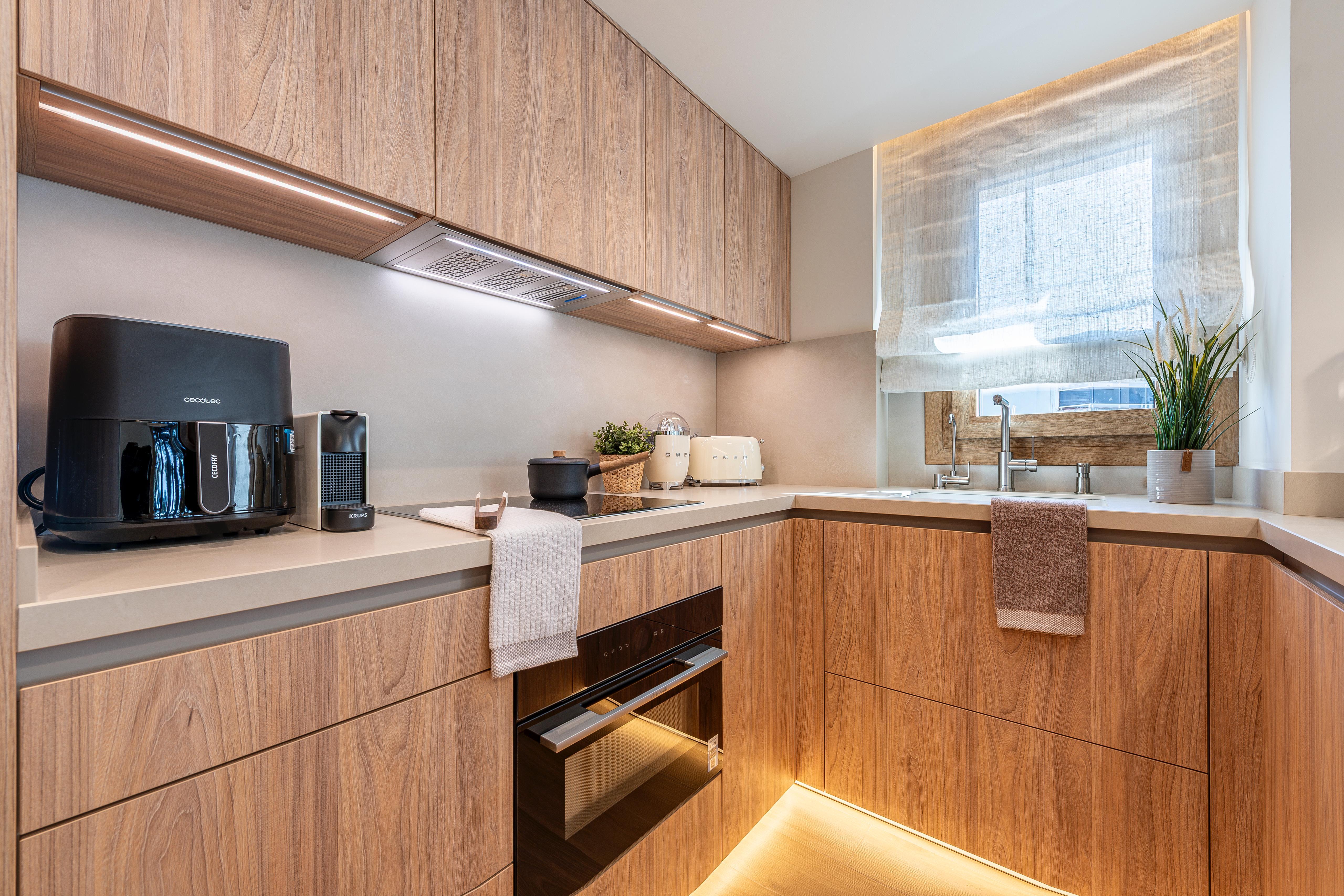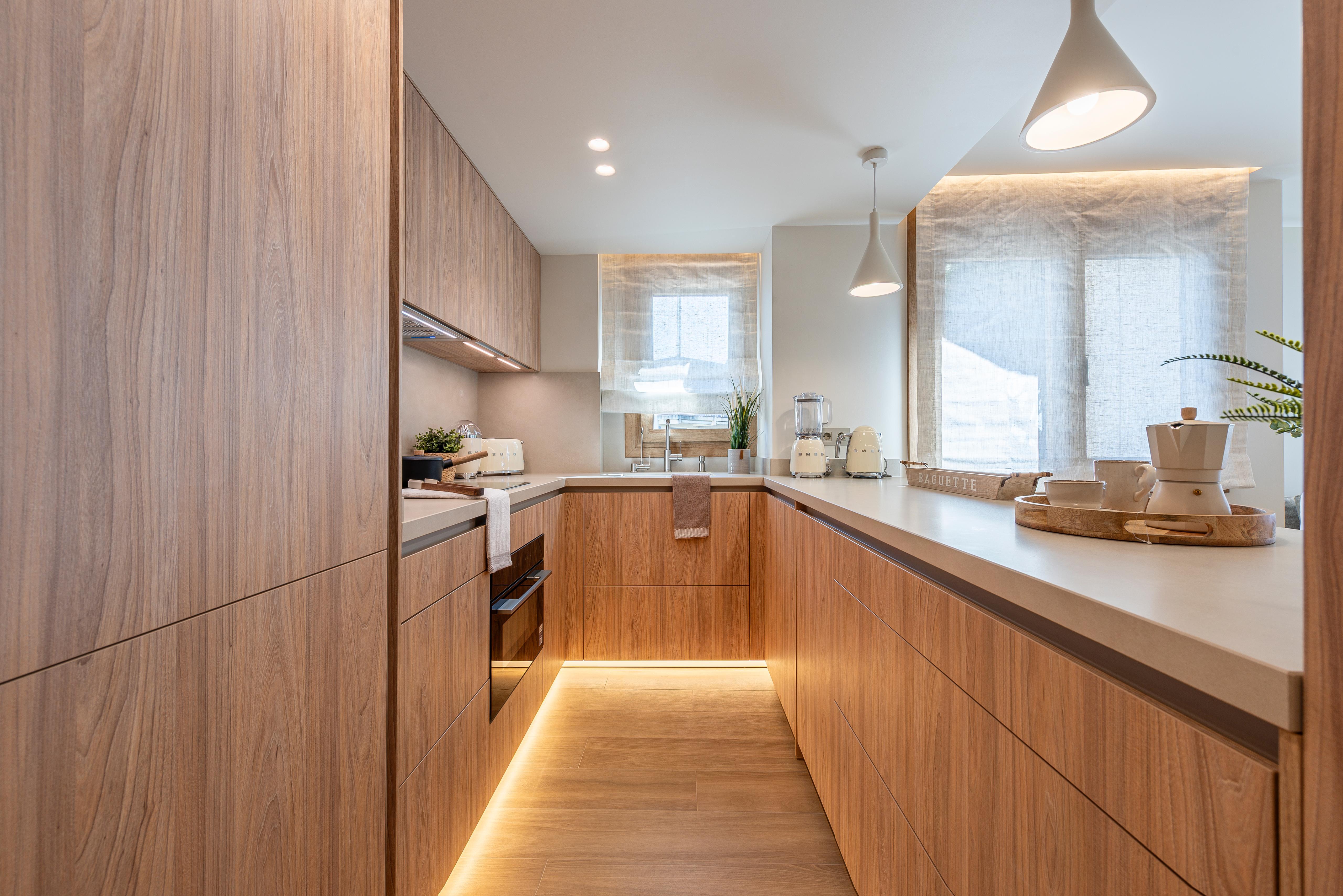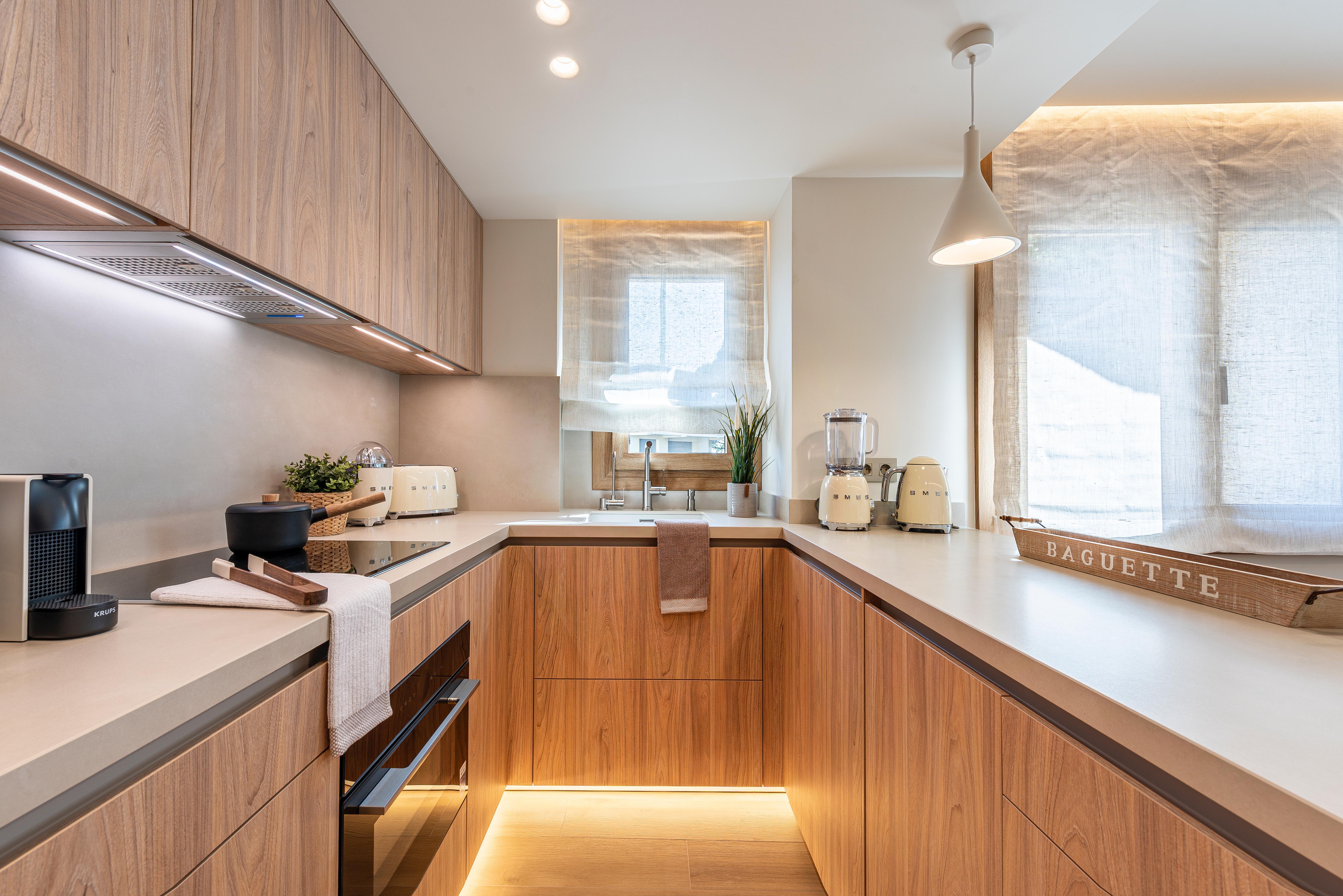 La cocina, abierta al salón‑comedor, se organiza en U con muebles de madera sin tiradores, y la continuidad de materiales genera una imagen fluida y acogedora. La encimera de textura mineral y tonos neutros, coordinada con el frontal, aporta equilibrio visual y calidez.