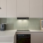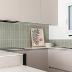 El frontal de trabajo luce un azulejo verde claro dispuesto verticalmente, aportando frescura y un toque natural. La encimera de mármol tipo Carrara sirve de superficie de apoyo y mesa de comedor, rematada con una estructura de madera clara que conecta con un estante lateral abierto para utensilios o piezas decorativas.
