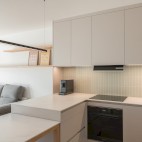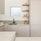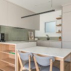 A la derecha, una columna oculta el frigorífico, y las estanterías junto a la ventana permiten exhibir objetos personales sin romper la estética. La paleta de blancos, grises suaves y maderas claras, junto al pavimento cálido y la iluminación lineal suspendida, crea un ambiente sereno, moderno, acogedor y atemporal.