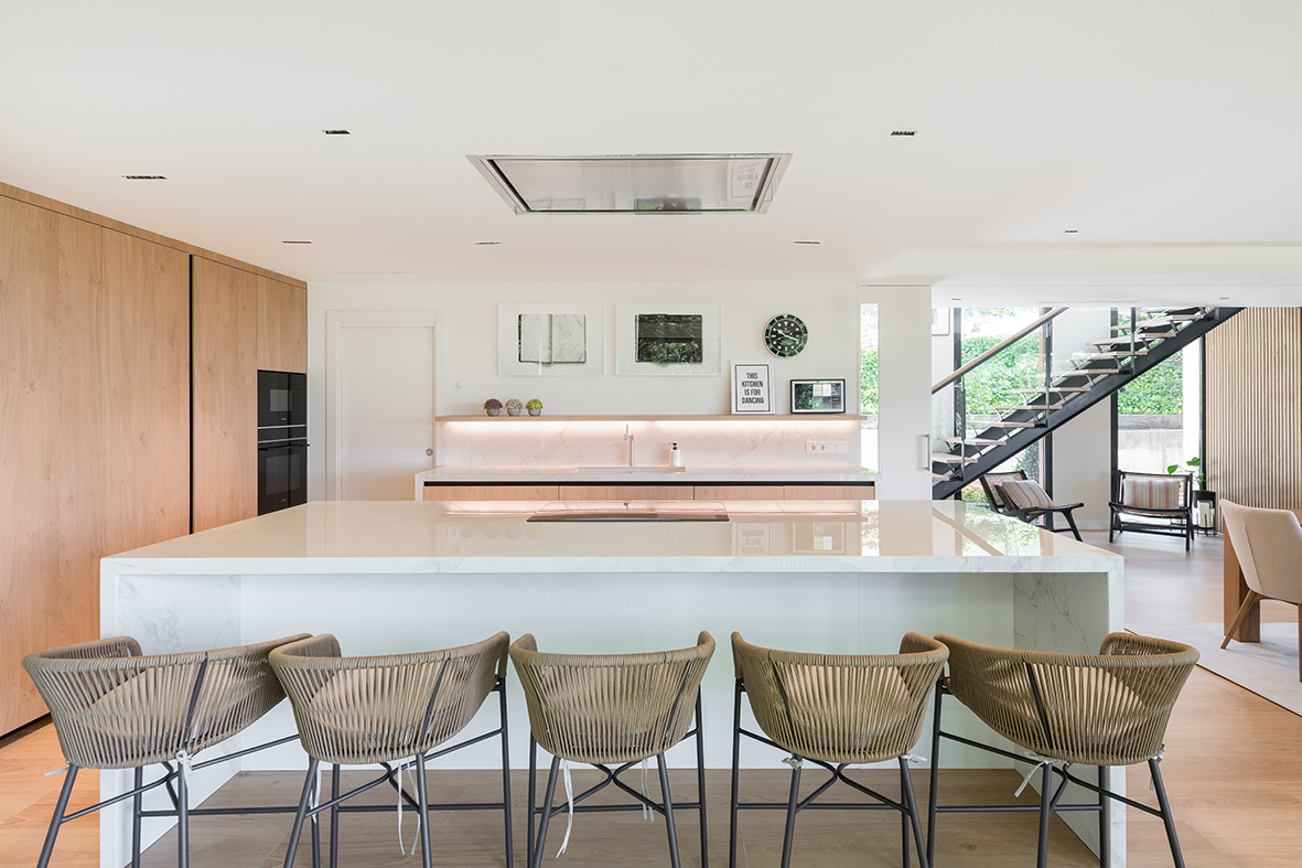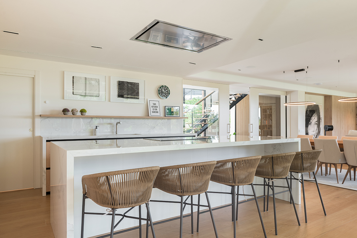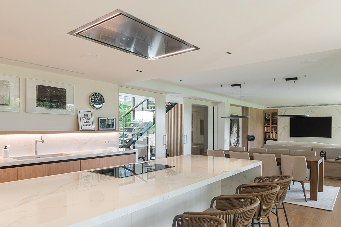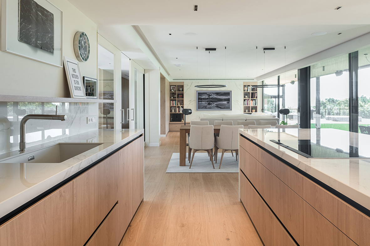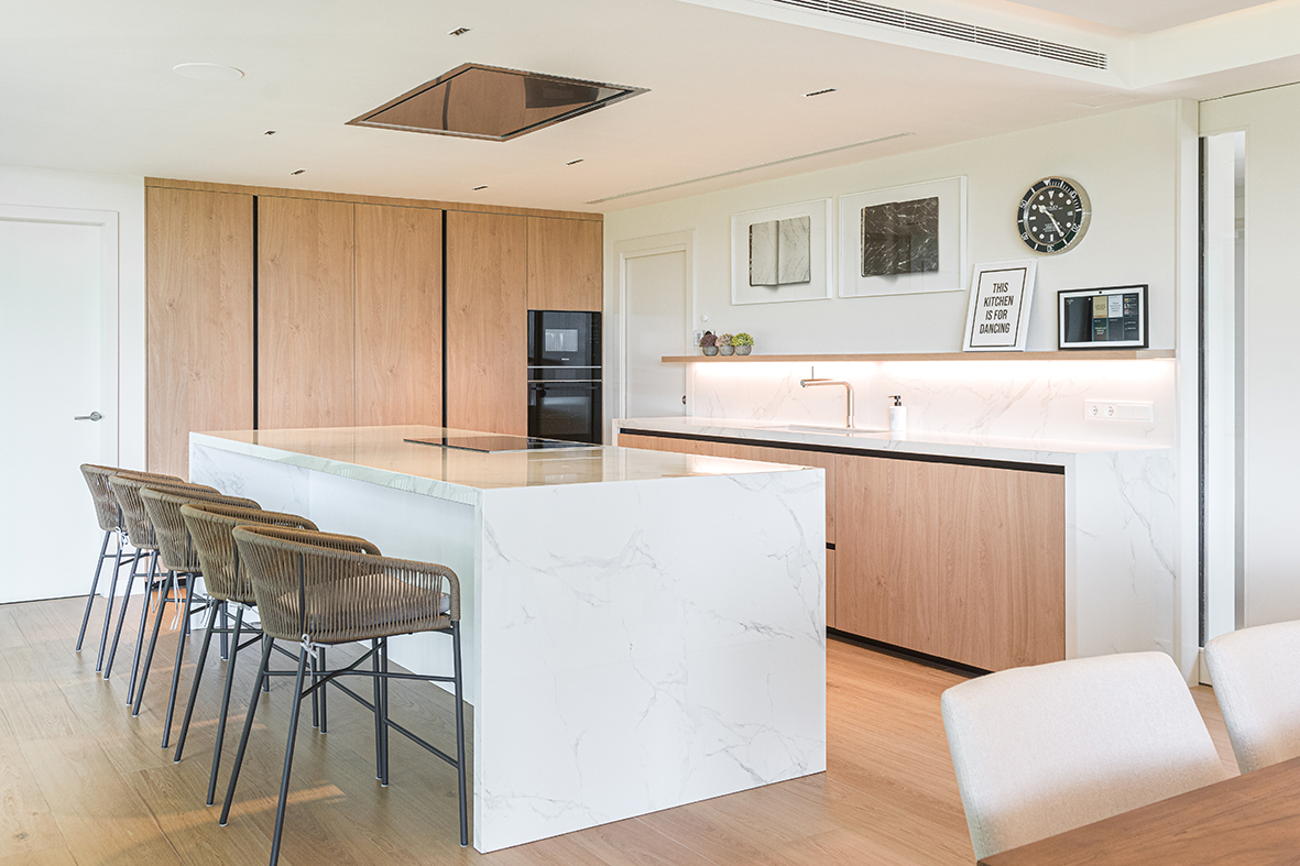 La encimera continua de Dekton Natura de 5 cm enmarca tanto la zona de aguas como la isla, manteniendo los tonos claros y el aire minimalista, al mismo tiempo conecta con el comedor; el estante con la iluminación inferior aporta ligereza al conjunto.