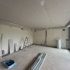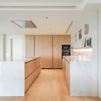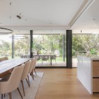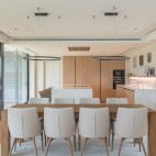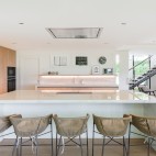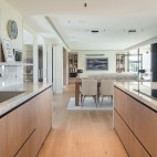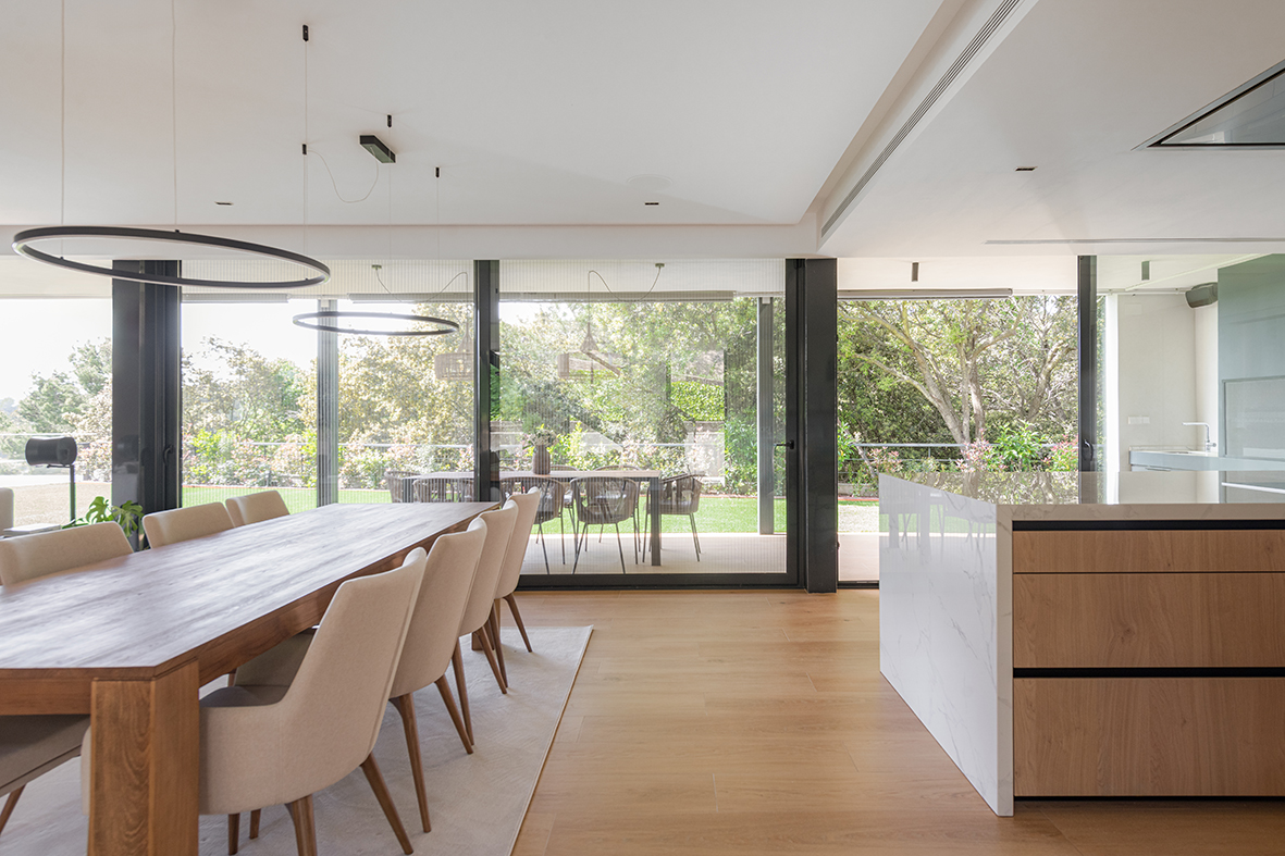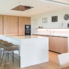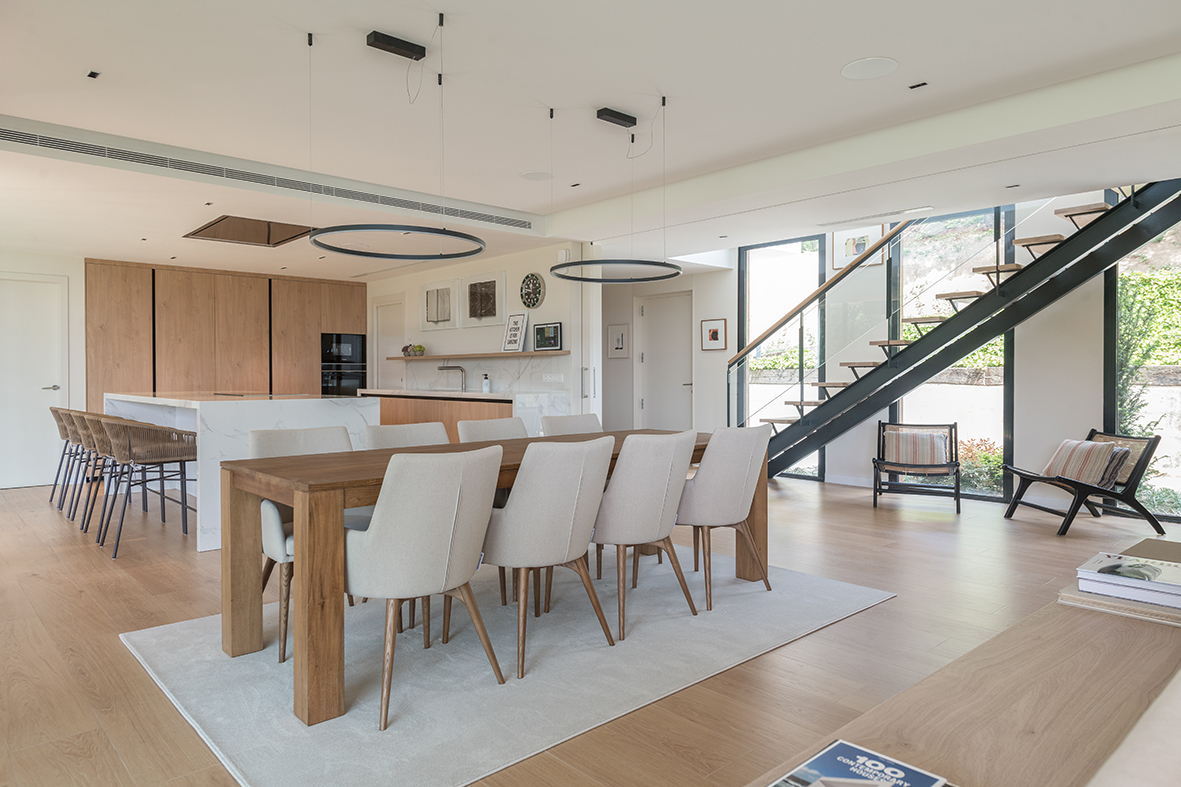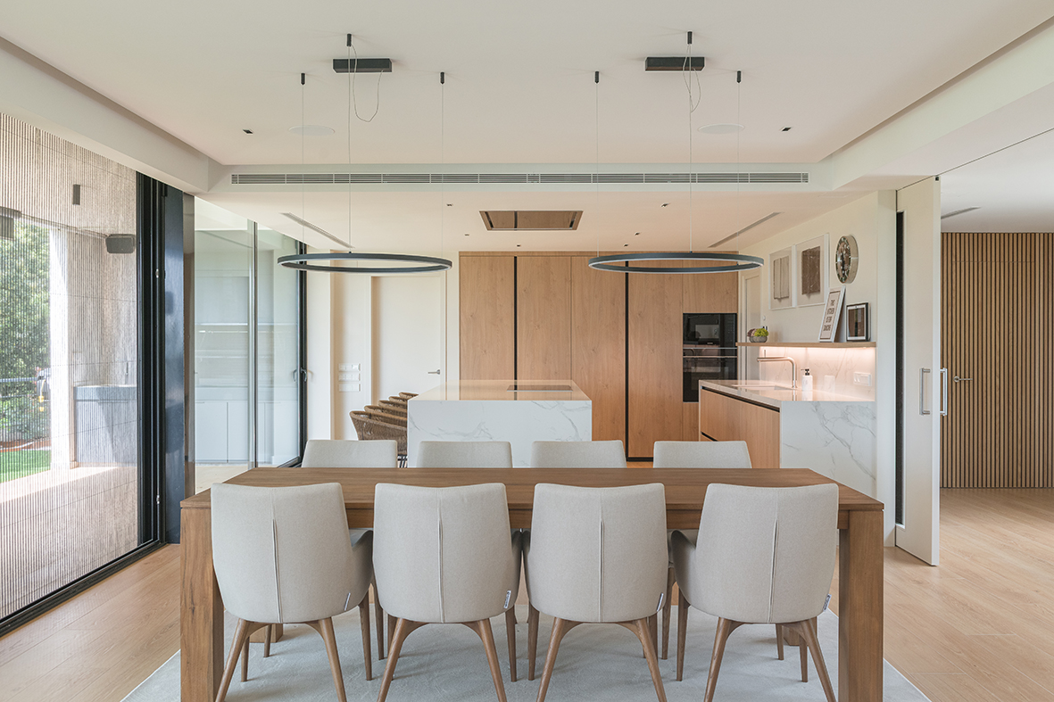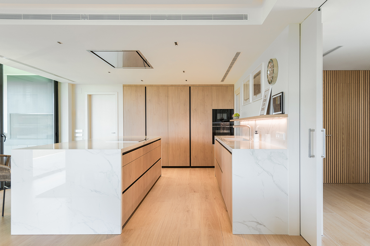 La encimera continua de Dekton Natura de 5 cm enmarca tanto la zona de aguas como la isla, manteniendo los tonos claros y el aire minimalista, al mismo tiempo conecta con el comedor; el estante con la iluminación inferior aporta ligereza al conjunto.