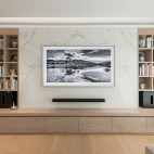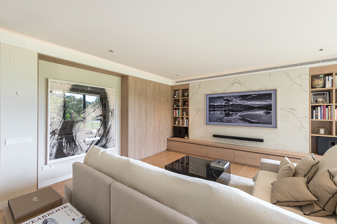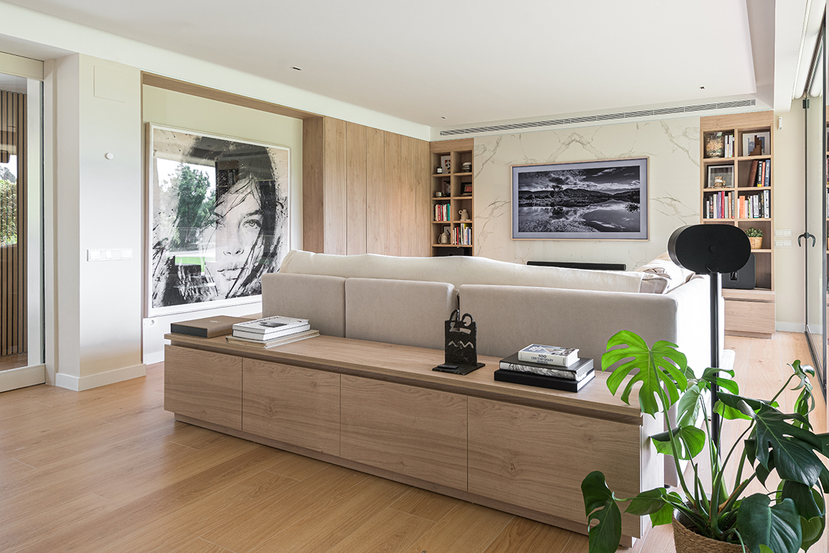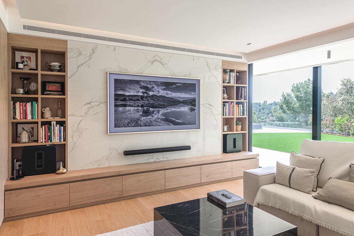 La pared del televisor, revestida con Dekton Natura, integra la tele empotrada entre estantes de madera, combinando confort moderno con un toque atemporal.