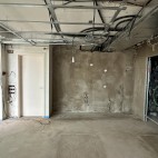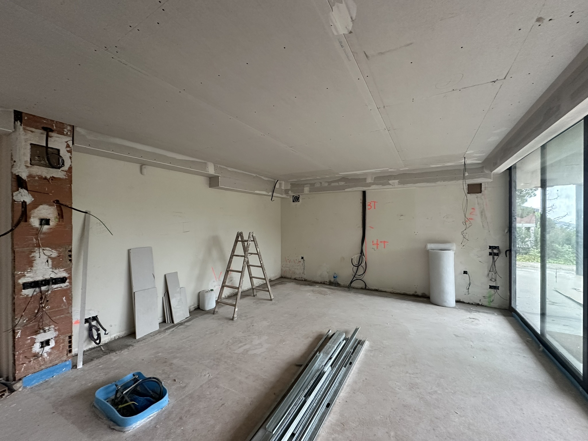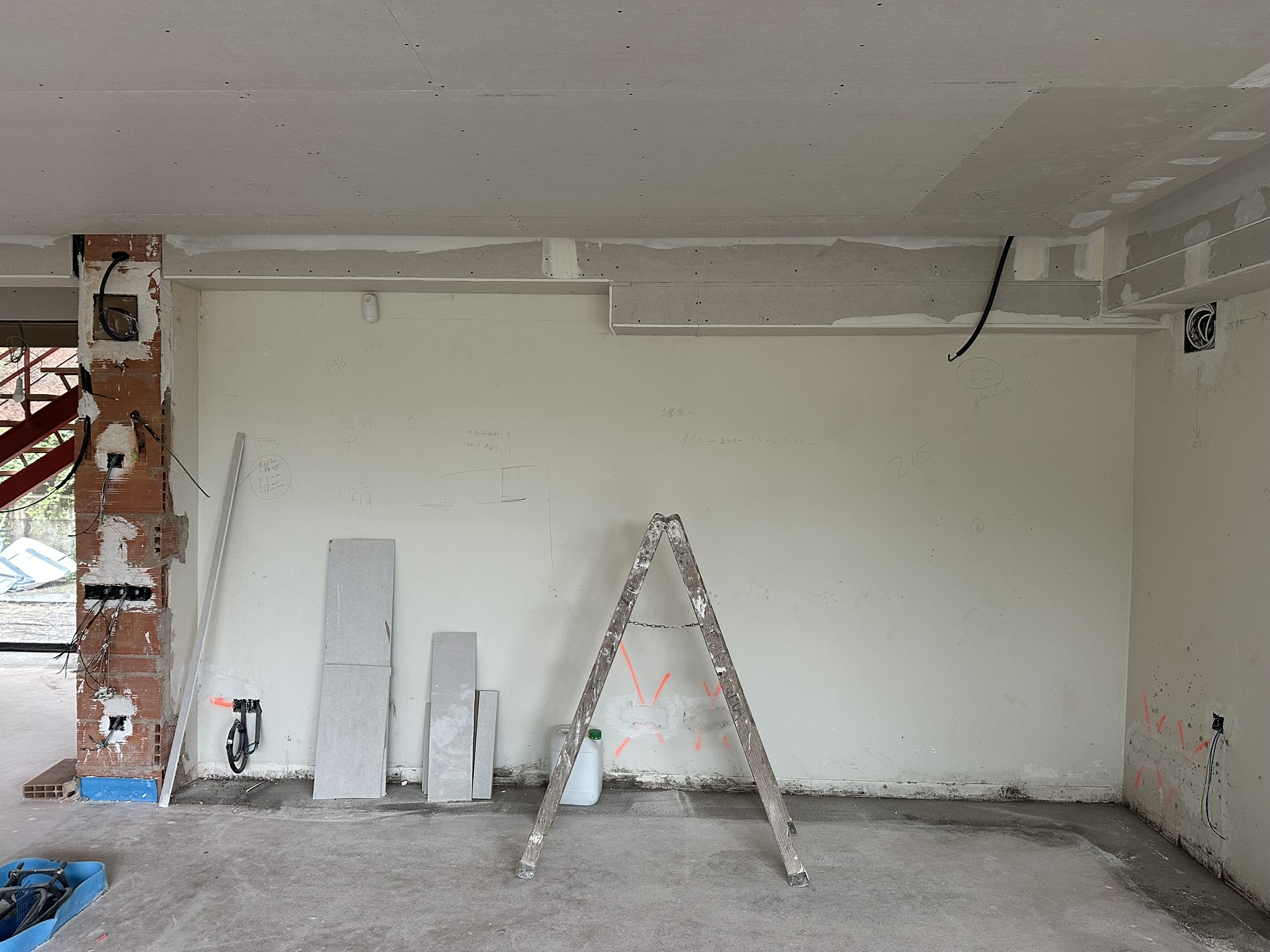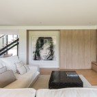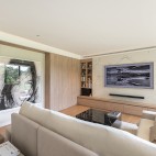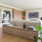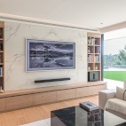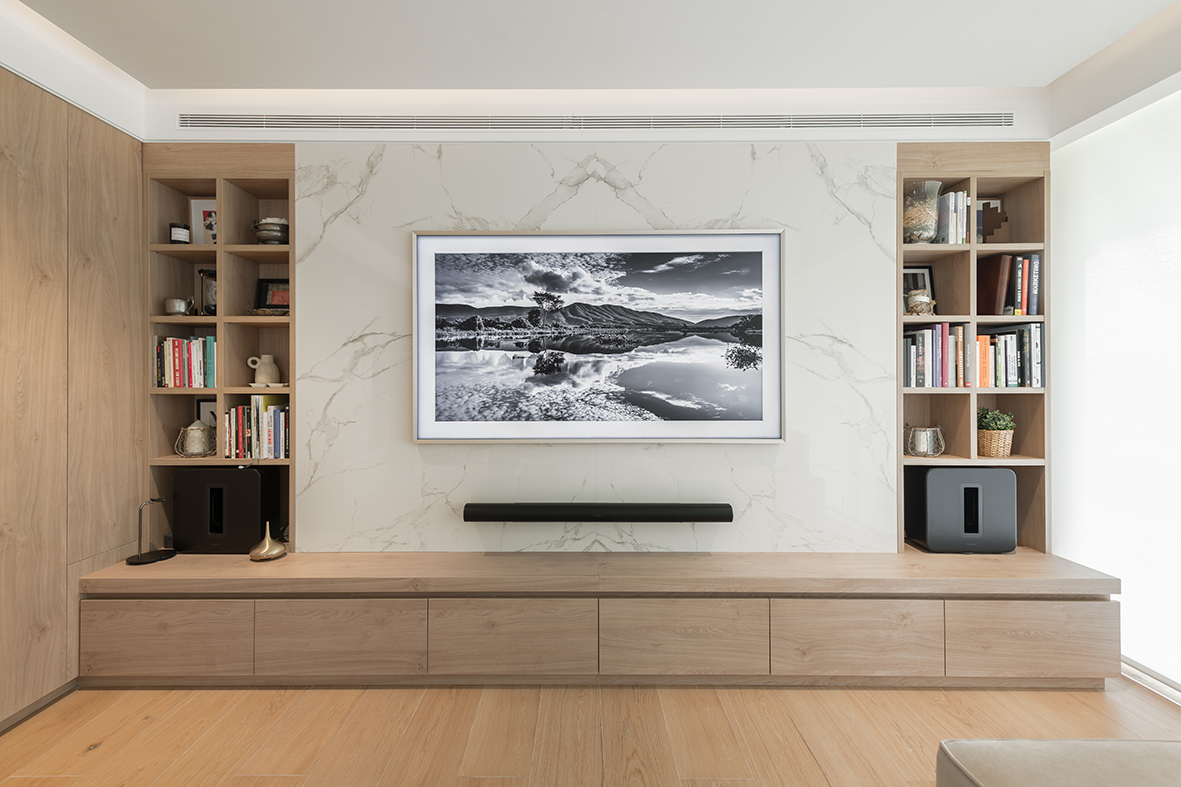 La pared del televisor, revestida con Dekton Natura, integra la tele empotrada entre estantes de madera, combinando confort moderno con un toque atemporal.