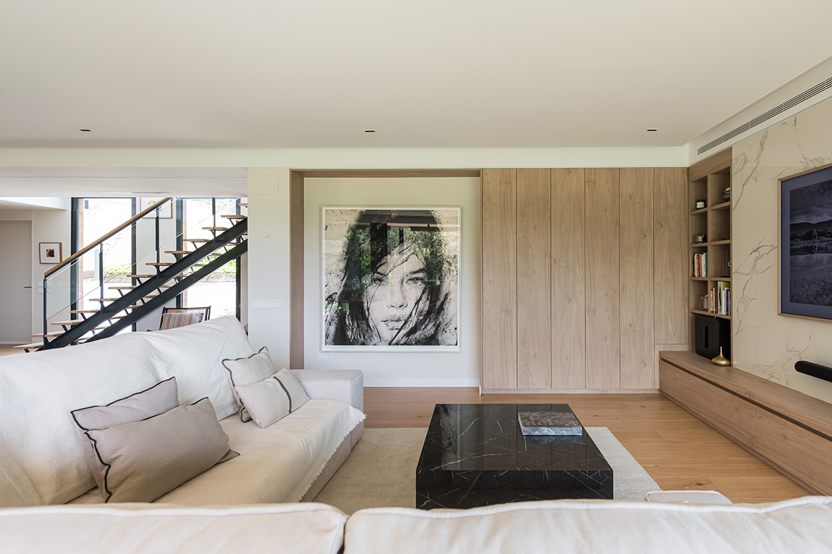 El salón, abierto y luminoso, tiene un mueble de roble a medida detrás del sofá que hace de banco y expositor.