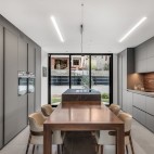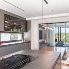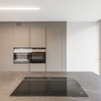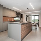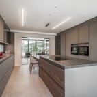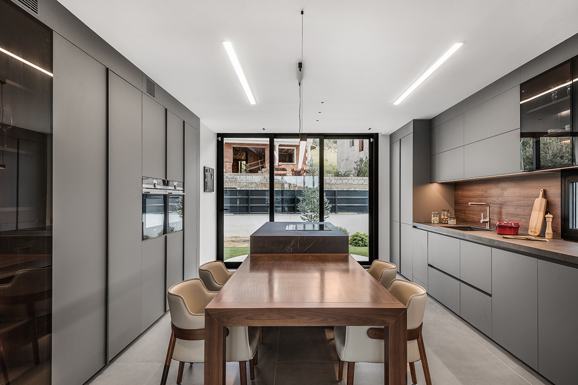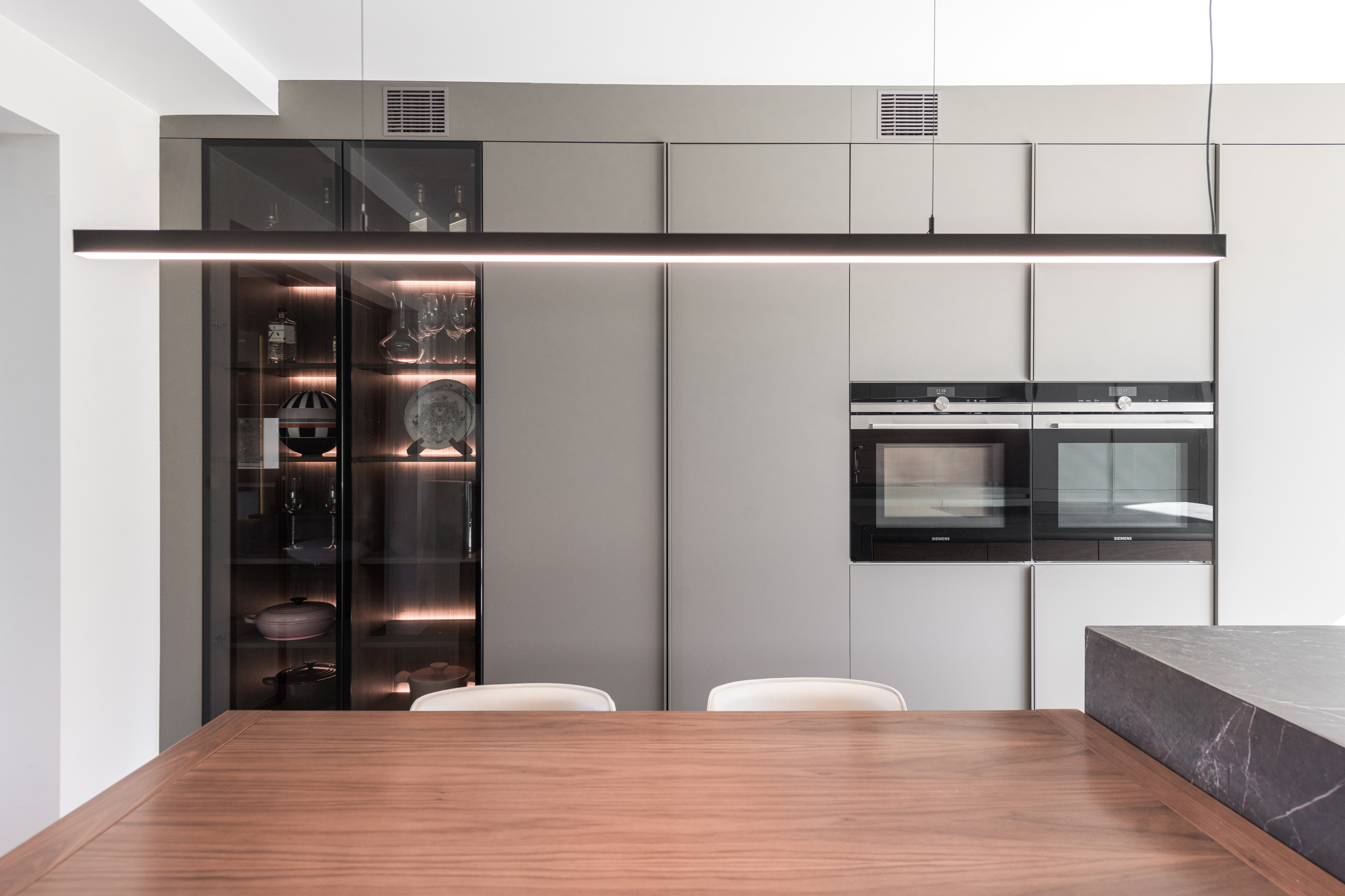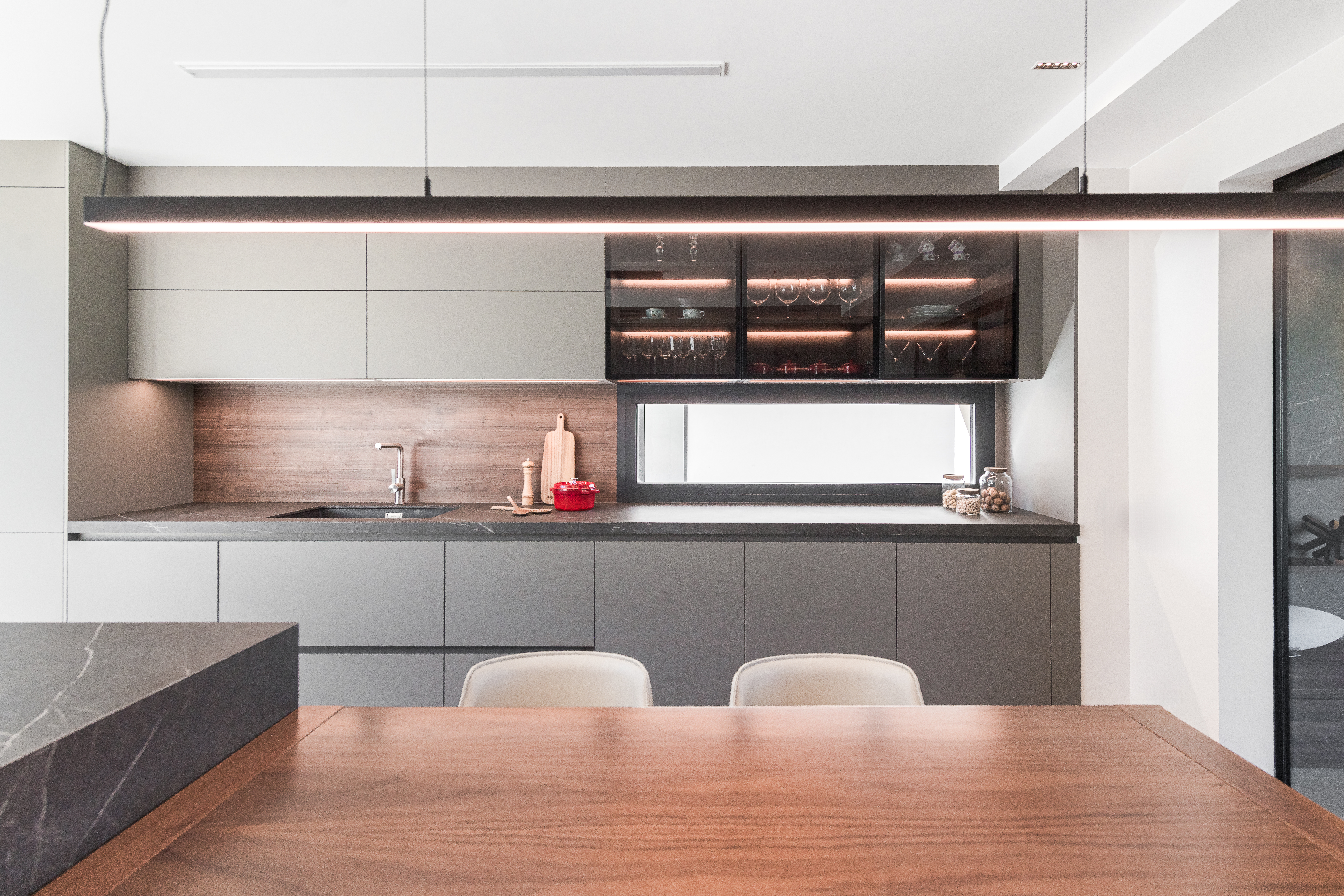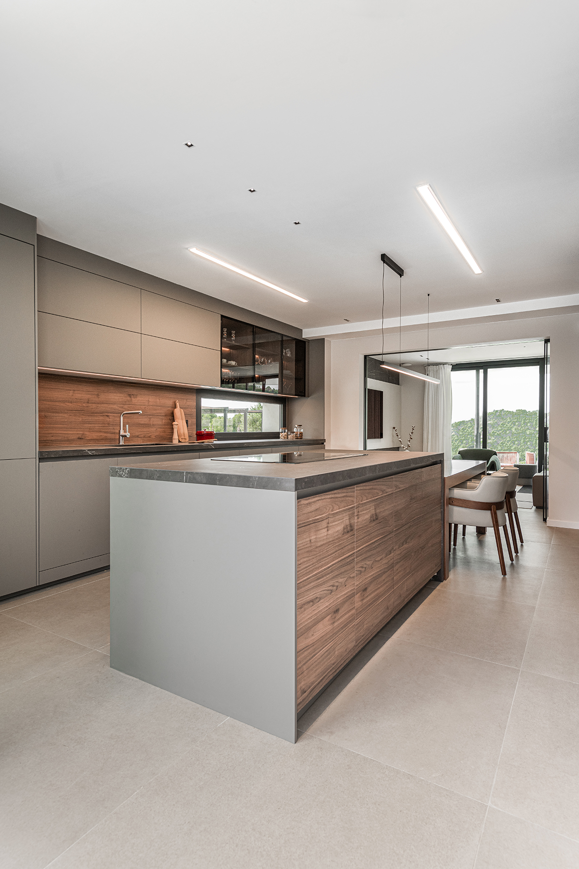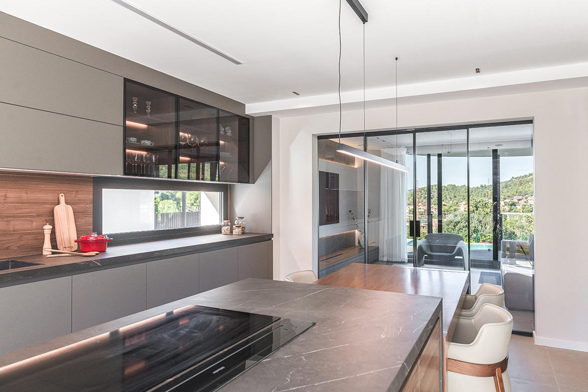 La cocina, sofisticada, destaca por su paleta oscura y toques en madera. La encimera y el frontal en porcelanico con vetas pronunciadas refuerzan la elegancia y la limpieza visual. El diseño prioriza el almacenaje oculto y la armonía con el resto de la casa.