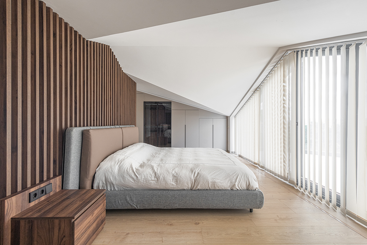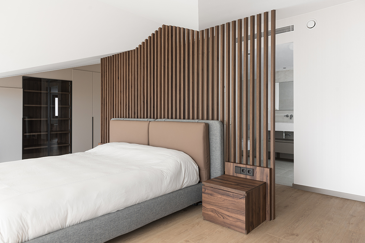 En las habitaciones, armarios y estanterías a medida optimizan el orden y la fluidez. La madera aporta calidez en el pavimento de parquet y en detalles de mobiliario.