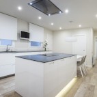 Cocina: Zona de fuegos en la isla con campana a techo, zona de aguas en última con una buena encimera y columnas recogidas integrante varios electrodomésticos. Cocina abierta muy práctica con una mesa junto como comedor de la cocina.